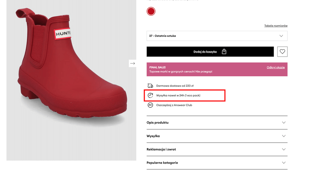 Projektując kartę produktową rzadko przykładamy dużą wagę do informacji o terminie realizacji zamówienia. Skupiamy się na wyglądzie, zdjęciach, opisie, przycisku “Do koszyka”, a badania pokazują, że czas dostawy to jeden z najważniejszych czynników decydujących o podjęciu decyzji o zakupie. Prosty komunikat o dostępności produktu nie jest już wystarczający dla klienta. Informacja o terminie realizacji zamówienia musi być jasna i klarowna dla klienta już po pierwszym przeczytaniu. Nie zmuszaj go do główkowania i jeżeli tylko twoje procesy logistyczne na to pozwalają poinformuj klienta wprost o planowanej dacie dostawy. Gwarancja dostawy w danym dniu to też jedna z możliwych przewag jakie twój sklep może posiadać nad konkurencją.